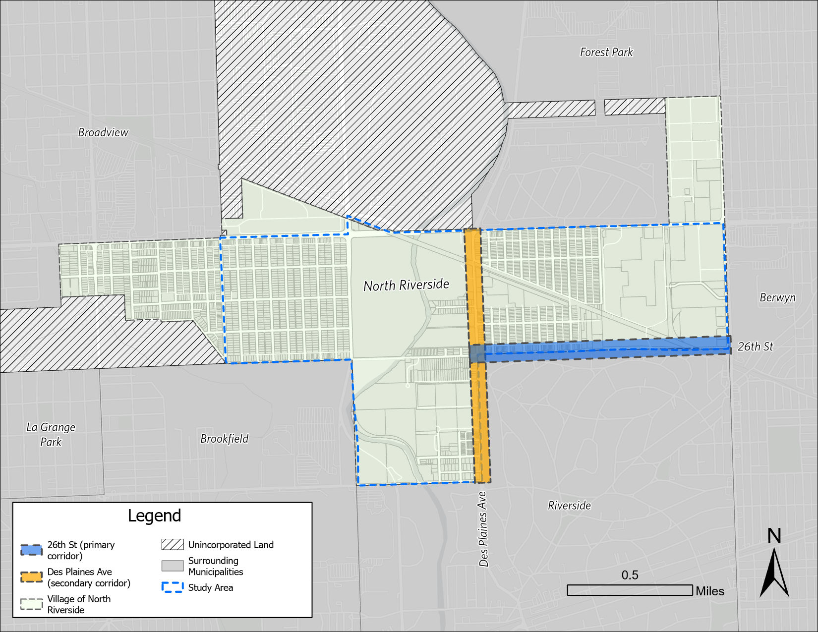 La Agencia Metropolitana de Planificación de Chicago (Chicago Metropolitan Agency for Planning, CMAP) y la Autoridad Regional de Transporte (Regional Transportation Authority, RTA) se asocian con el Pueblo de North Riverside crear un plan para transformar dos corredores. El corredor principal es la calle 26 entre la Desplaines Avenue y el Veterans Park, y el corredor secundario es la avenida Des Plaines desde la vía férrea de Canadian National Railway hacia el sur hasta la calle 31. Este plan servirá de guía para los residentes, los funcionarios electos y los líderes comunitarios a la hora de definir futuras decisiones, acciones y el desarrollo a lo largo de estos corredores en North Riverside.